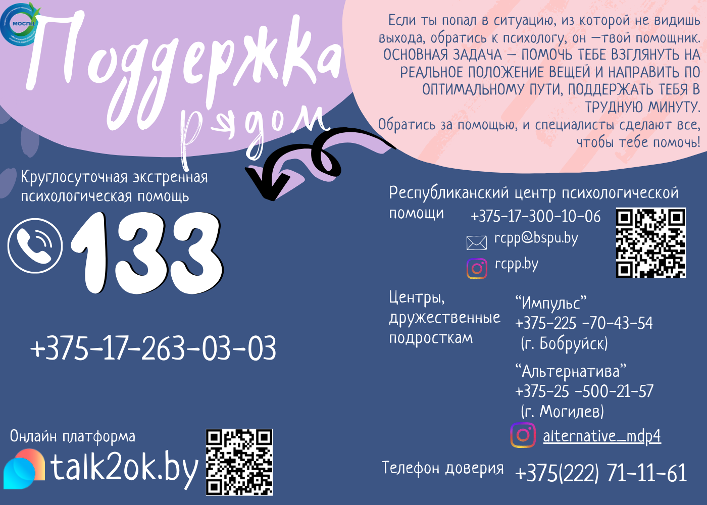 А также Вы можете обращаться на Детскую линию помощи (круглосуточно), учреждения здравоохранения "Городской клинический детский психиатрический диспансер" г.Минска по телефону: 8-801-100-16-11.